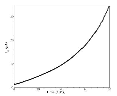 Semilogarithmic plot of current output over time. The linear region reflects exp