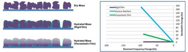 Figure 5: (left) Schematic diagram showing the Sauerbrey mass of different films and (right) plot of bandwidth vs. resonant frequency change for an ideal rigid film, viscous solution and an example viscoelastic layer