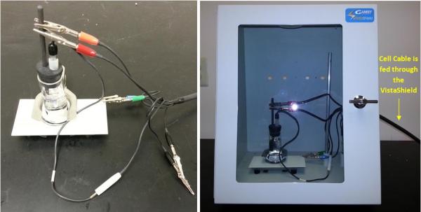 Figure 4: (Left) Cell prepared for testing showing where the cell cable leads are attached (Right) The cell is placed in a Faraday cage to reduce noise during testing. The cell cable is put through the Faraday cage